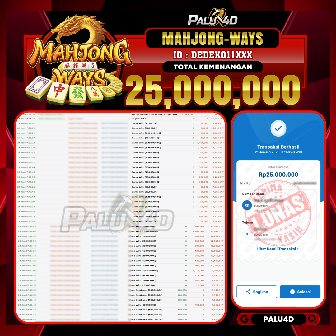 PALU4D – Selamat bagi pemenang yang mendapatkan jackpot hari ini 21 JANUARI 2026 di game Slot MAHJONG WAYS yang di sediakan situs palu4d dan sudah kami bayar lunas. Berikut data pemenang hari ini yang kami proses dengan cepat ke rekening tujuan yang terdaftar di akun selama ±10 menit.