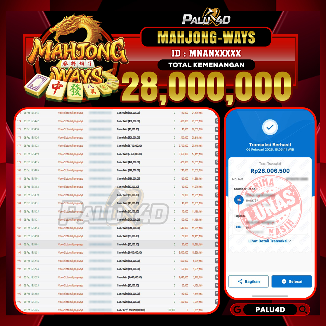 PALU4D – Selamat bagi pemenang yang mendapatkan jackpot hari ini 06 FEBRUARI 2026 di game Slot MAHJONG WAYS yang di sediakan situs palu4d dan sudah kami bayar lunas. Berikut data pemenang hari ini yang kami proses dengan cepat ke rekening tujuan yang terdaftar di akun selama ±10 menit.