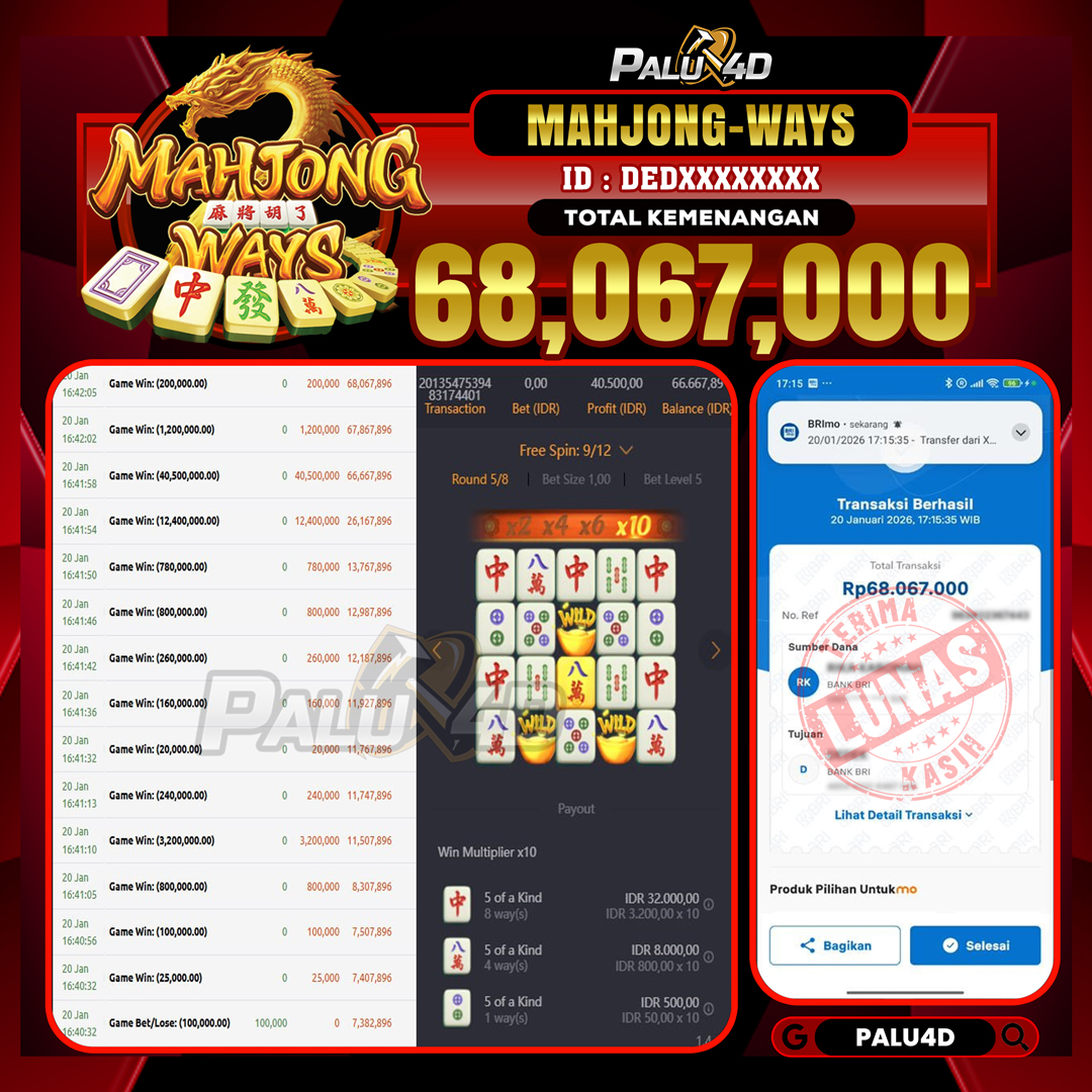 PALU4D – Selamat bagi pemenang yang mendapatkan jackpot hari ini 20 JANUARI 2026 di game Slot MAHJONG WAYS yang di sediakan situs palu4d dan sudah kami bayar lunas. Berikut data pemenang hari ini yang kami proses dengan cepat ke rekening tujuan yang terdaftar di akun selama ±10 menit.
