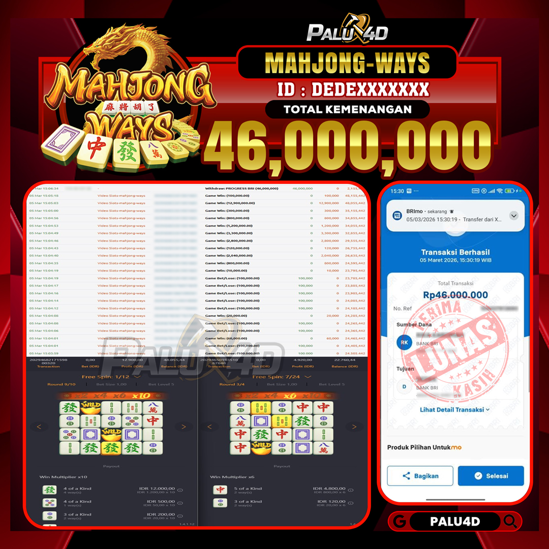 PALU4D – Selamat bagi pemenang yang mendapatkan jackpot hari ini 05 MARET 2026 di game Slot MAHJONG WINS yang di sediakan situs palu4d dan sudah kami bayar lunas. Berikut data pemenang hari ini yang kami proses dengan cepat ke rekening tujuan yang terdaftar di akun selama ±10 menit.