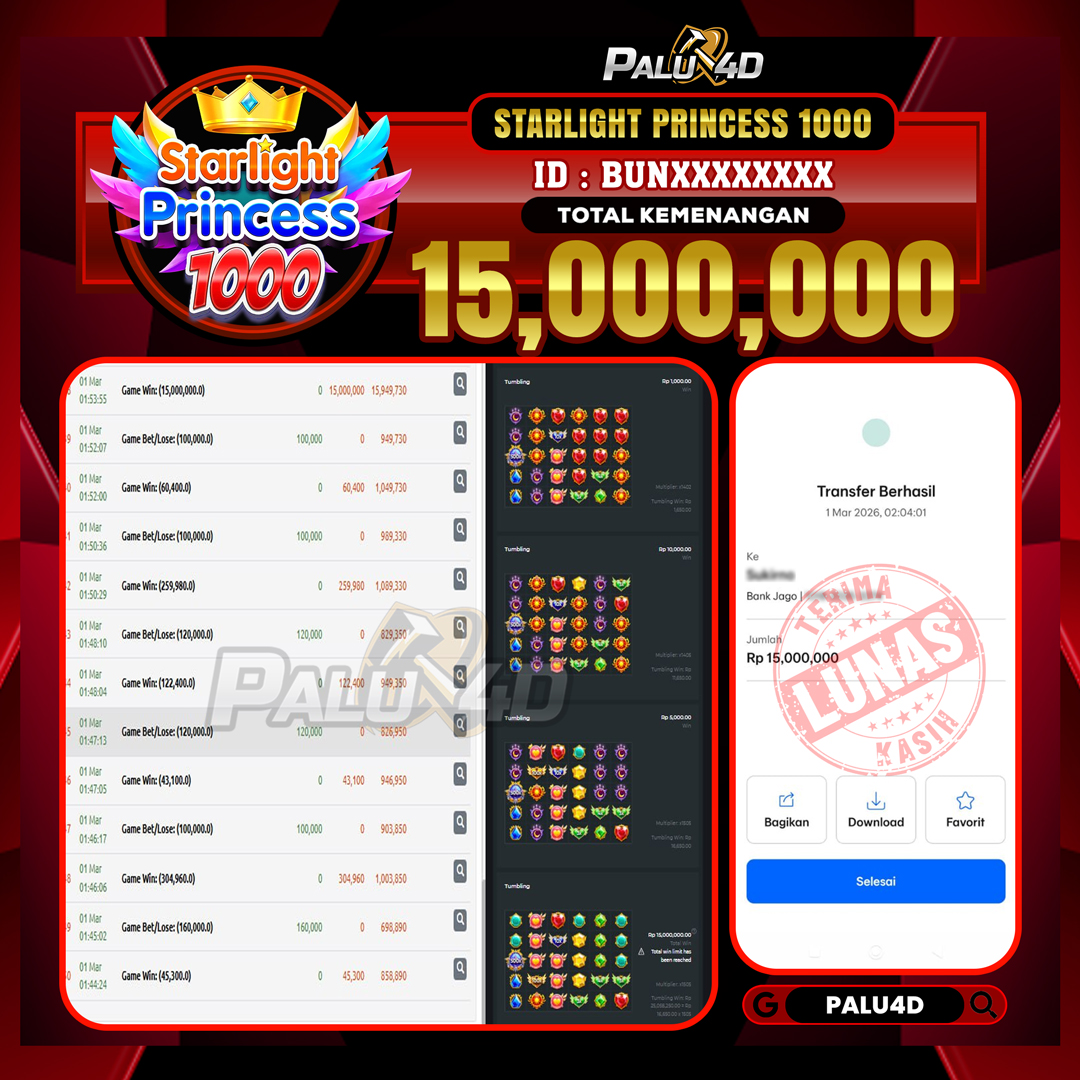 PALU4D – Menang Slot STARLIGHT PRINCESS 1000 Rp.15.000.000.,- LUNAS