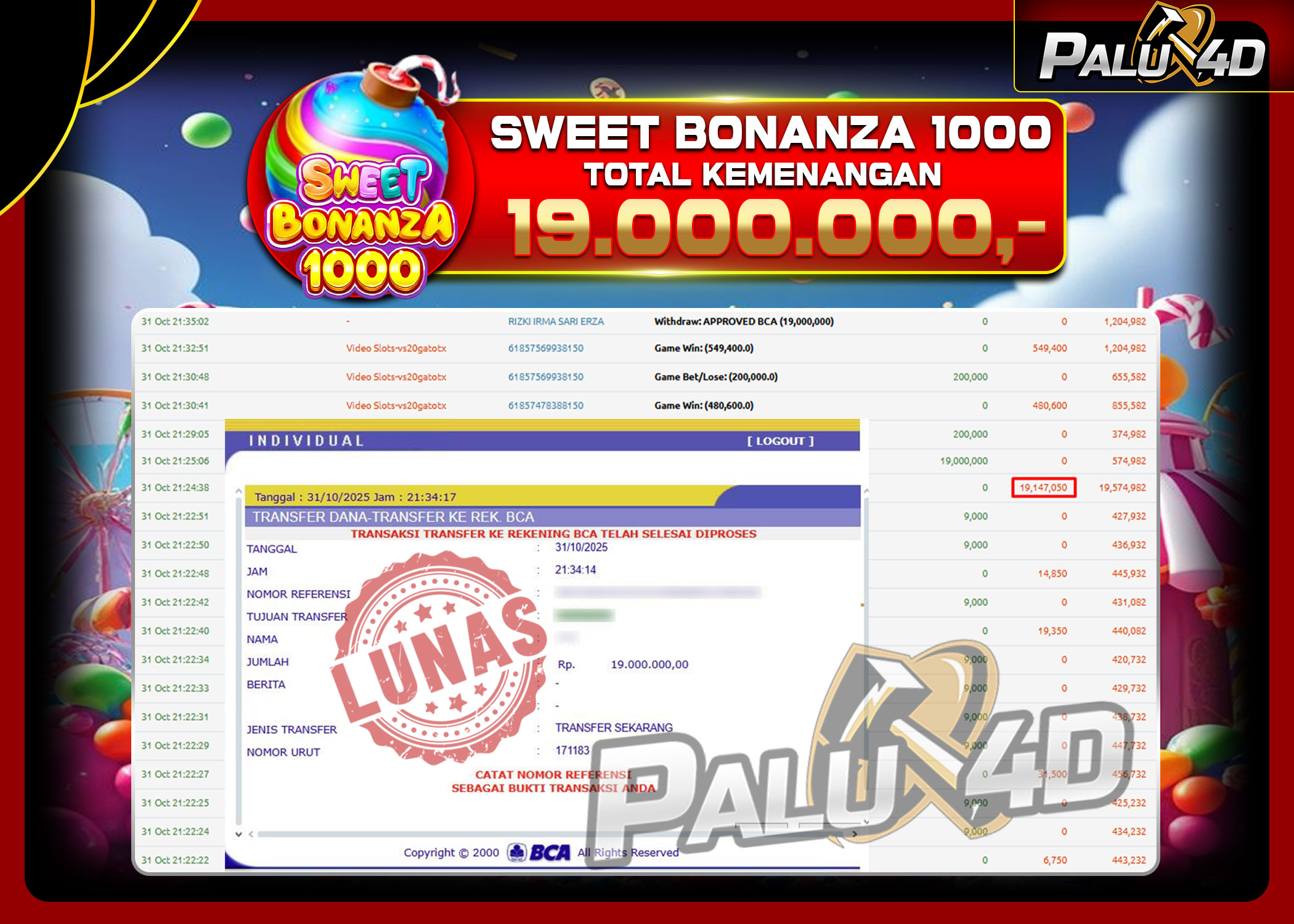 PALU4D – Selamat bagi pemenang yang mendapatkan jackpot hari ini 31 OKTOBER 2025 di game Slot SWEET BONANZA 1000 yang di sediakan situs palu4d dan sudah kami bayar lunas. Berikut data pemenang hari ini yang kami proses dengan cepat ke rekening tujuan yang terdaftar di akun selama ±10 menit.