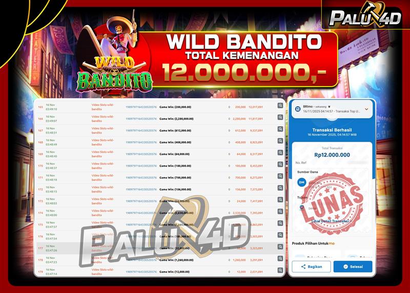 PALU4D – Selamat bagi pemenang yang mendapatkan jackpot hari ini 16 NOVEMBER 2025 di game Slot WILD BANDITO yang di sediakan situs palu4d dan sudah kami bayar lunas. Berikut data pemenang hari ini yang kami proses dengan cepat ke rekening tujuan yang terdaftar di akun selama ±10 menit.