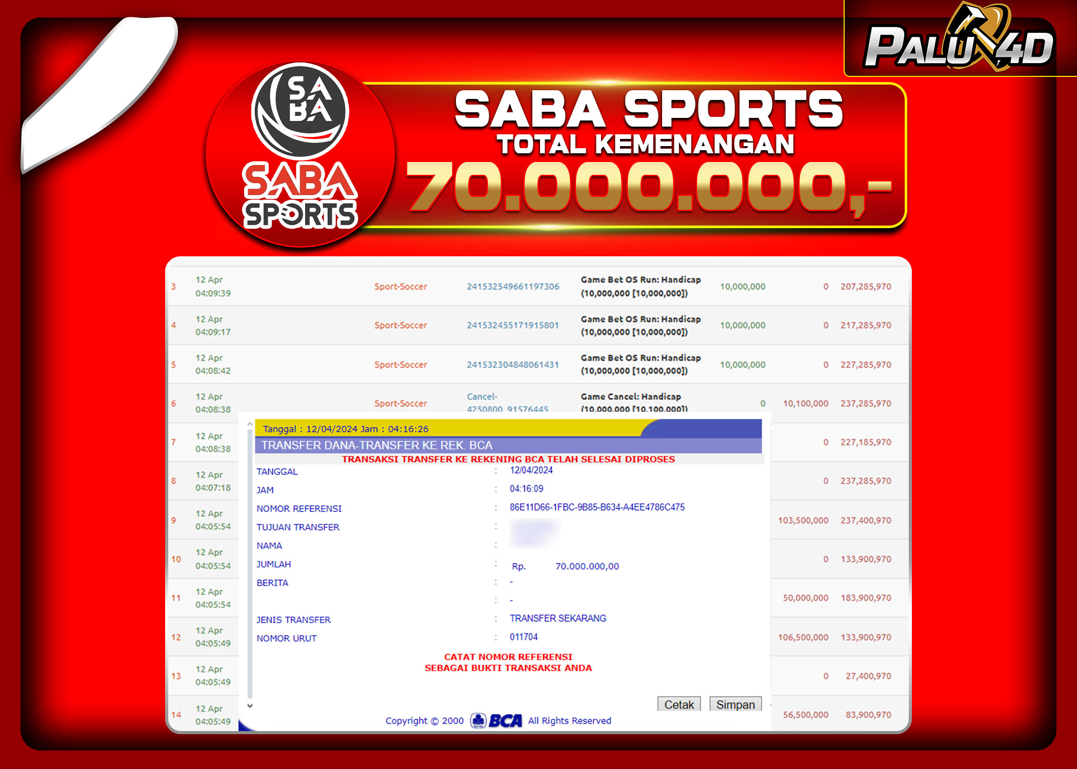 PALU4D – Menang SPORTBOOKS TARUHAN BOLA Rp.70.000.000.,- LUNAS