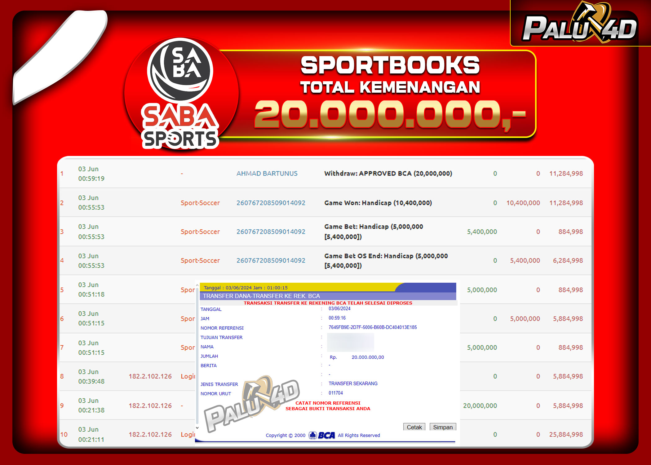 PALU4D – Menang SPORTBOOKS TARUHAN BOLA Rp.20.000.000.,- LUNAS