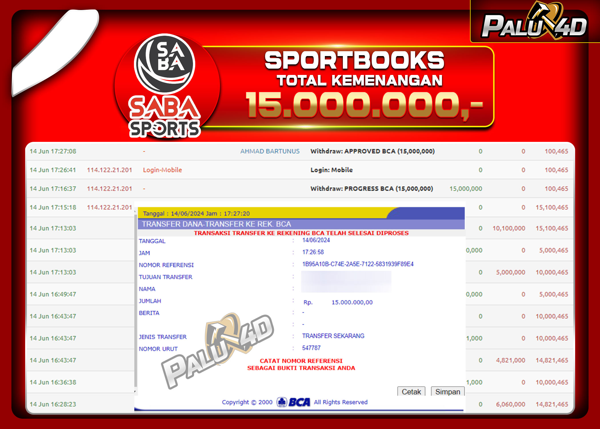 PALU4D – Selamat bagi pemenang yang mendapatkan jackpot hari ini 14 Juni 2024 di game Sportbook TARUHAN BOLA yang di sediakan situs palu4d dan sudah kami bayar lunas. Berikut data pemenang hari ini yang kami proses dengan cepat ke rekening tujuan yang terdaftar di akun selama ±10 menit.