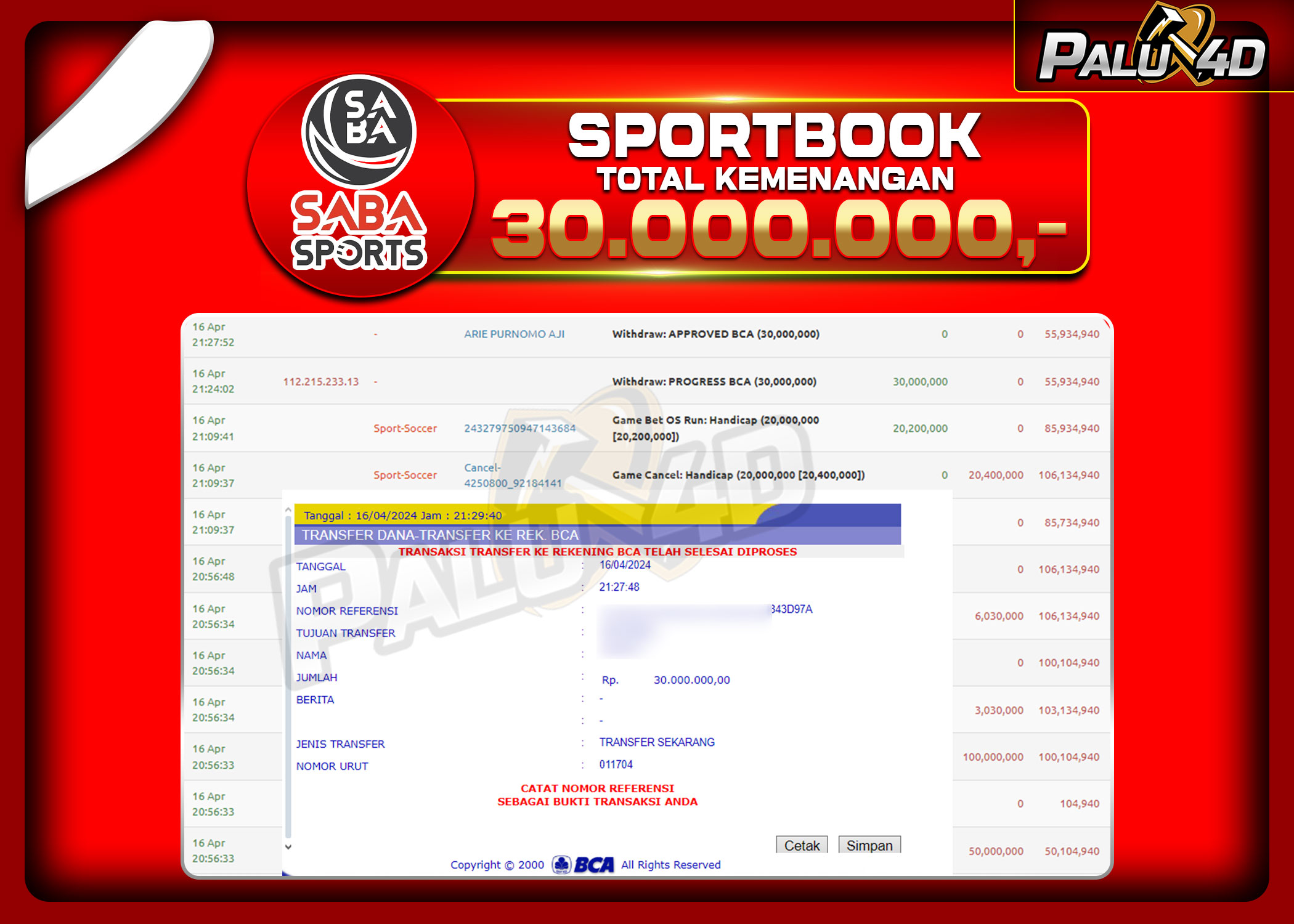 PALU4D – Menang SPORTBOOKS TARUHAN BOLA Rp.30.000.000.,- LUNAS