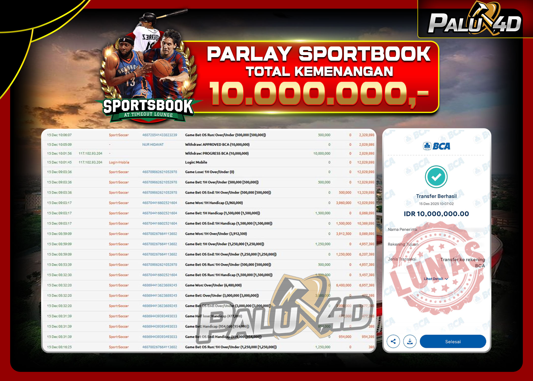 PALU4D – Selamat bagi pemenang yang mendapatkan jackpot hari ini 15 DESEMBER 2025 di game Sportbook TARUHAN BOLA yang di sediakan situs palu4d dan sudah kami bayar lunas. Berikut data pemenang hari ini yang kami proses dengan cepat ke rekening tujuan yang terdaftar di akun selama ±10 menit.