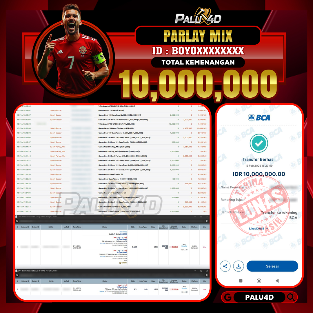 PALU4D – Selamat bagi pemenang yang mendapatkan jackpot hari ini 15 FEBRUARI 2026 di game Sportbook TARUHAN BOLA yang di sediakan situs palu4d dan sudah kami bayar lunas. Berikut data pemenang hari ini yang kami proses dengan cepat ke rekening tujuan yang terdaftar di akun selama ±10 menit.