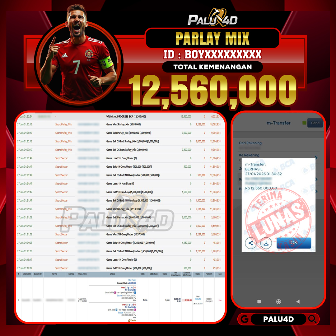 PALU4D – Selamat bagi pemenang yang mendapatkan jackpot hari ini 27 JANUARI 2026 di game Sportbook TARUHAN BOLA yang di sediakan situs palu4d dan sudah kami bayar lunas. Berikut data pemenang hari ini yang kami proses dengan cepat ke rekening tujuan yang terdaftar di akun selama ±10 menit.