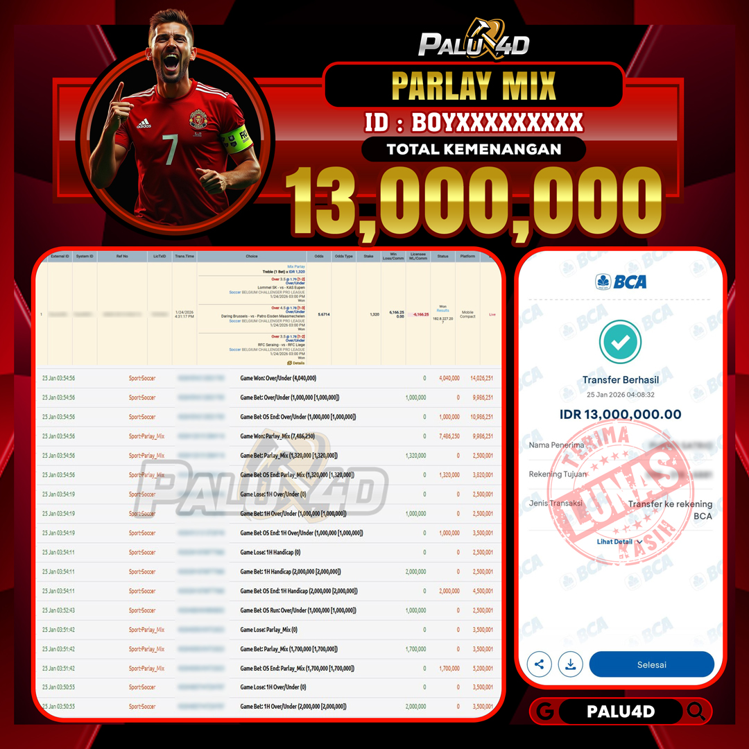 PALU4D – Selamat bagi pemenang yang mendapatkan jackpot hari ini 25 JANUARI 2026 di game Sportbook TARUHAN BOLA yang di sediakan situs palu4d dan sudah kami bayar lunas. Berikut data pemenang hari ini yang kami proses dengan cepat ke rekening tujuan yang terdaftar di akun selama ±10 menit.