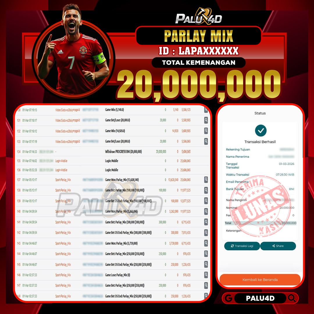 PALU4D – Selamat bagi pemenang yang mendapatkan jackpot hari ini 01 MARET 2026 di game Sportbook TARUHAN BOLA yang di sediakan situs palu4d dan sudah kami bayar lunas. Berikut data pemenang hari ini yang kami proses dengan cepat ke rekening tujuan yang terdaftar di akun selama ±10 menit.