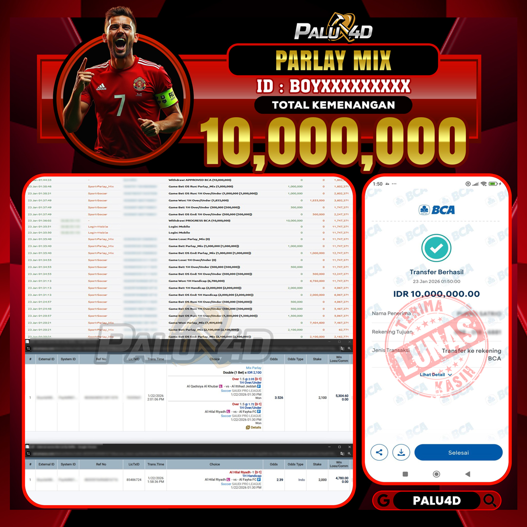 PALU4D – Selamat bagi pemenang yang mendapatkan jackpot hari ini 23 JANUARI 2026 di game Sportbook TARUHAN BOLA yang di sediakan situs palu4d dan sudah kami bayar lunas. Berikut data pemenang hari ini yang kami proses dengan cepat ke rekening tujuan yang terdaftar di akun selama ±10 menit.