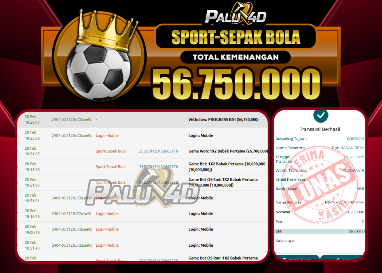 PALU4D – Selamat bagi pemenang yang mendapatkan jackpot hari ini 20 February 2025 di game Sportbook TARUHAN BOLA yang di sediakan situs palu4d dan sudah kami bayar lunas. Berikut data pemenang hari ini yang kami proses dengan cepat ke rekening tujuan yang terdaftar di akun selama ±10 menit.