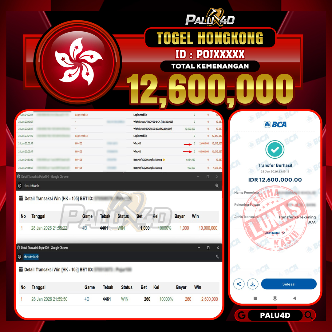 PALU4D – Selamat bagi pemenang yang mendapatkan jackpot hari ini 28 JANUARI 2026 di game Togel HONGKONG yang di sediakan situs palu4d dan sudah kami bayar lunas. Berikut data pemenang hari ini yang kami proses dengan cepat ke rekening tujuan yang terdaftar di akun selama ±10 menit.