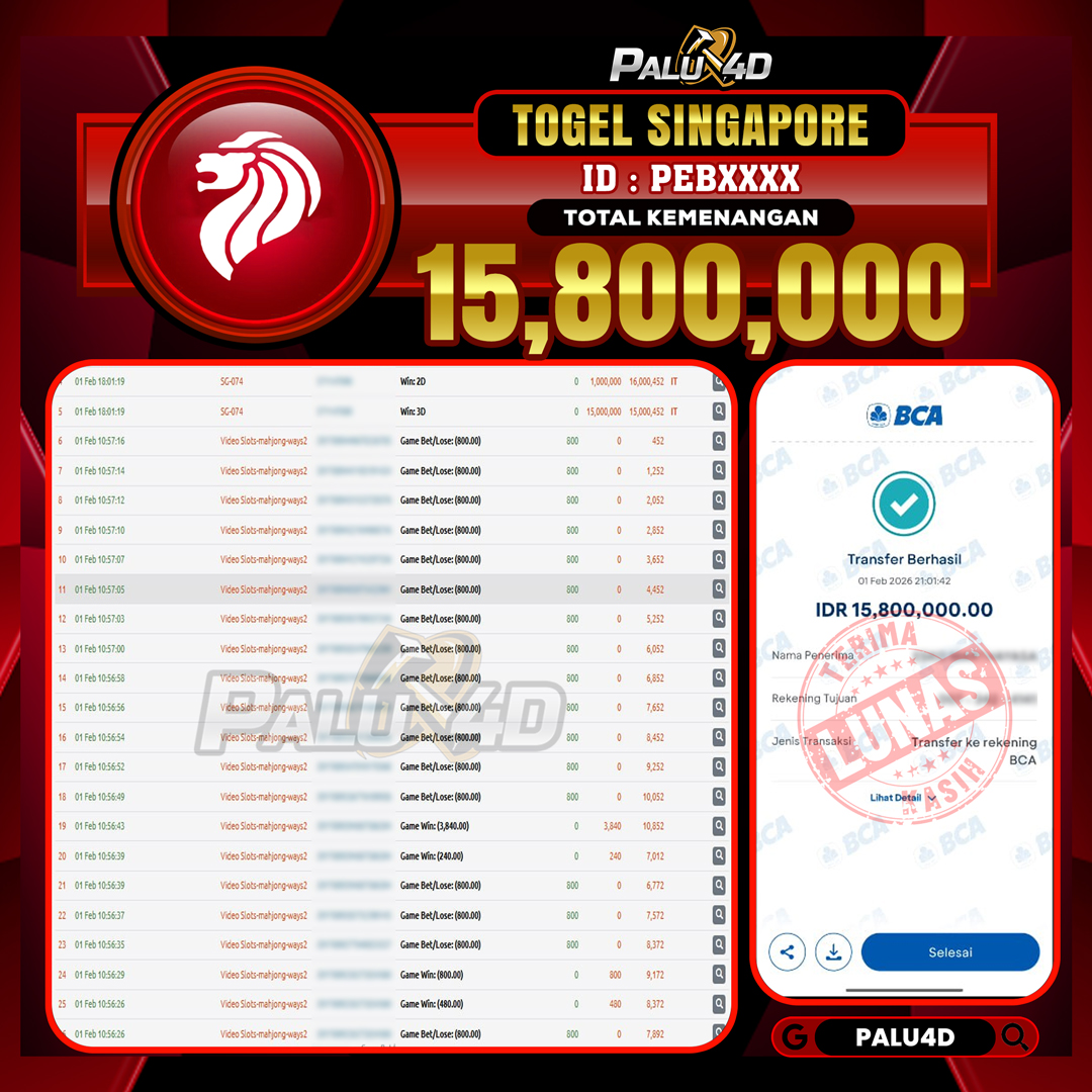 PALU4D – Selamat bagi pemenang yang mendapatkan jackpot hari ini 01 FEBRUARI 2026 di game Togel SINGAPORE yang di sediakan situs palu4d dan sudah kami bayar lunas. Berikut data pemenang hari ini yang kami proses dengan cepat ke rekening tujuan yang terdaftar di akun selama ±10 menit.