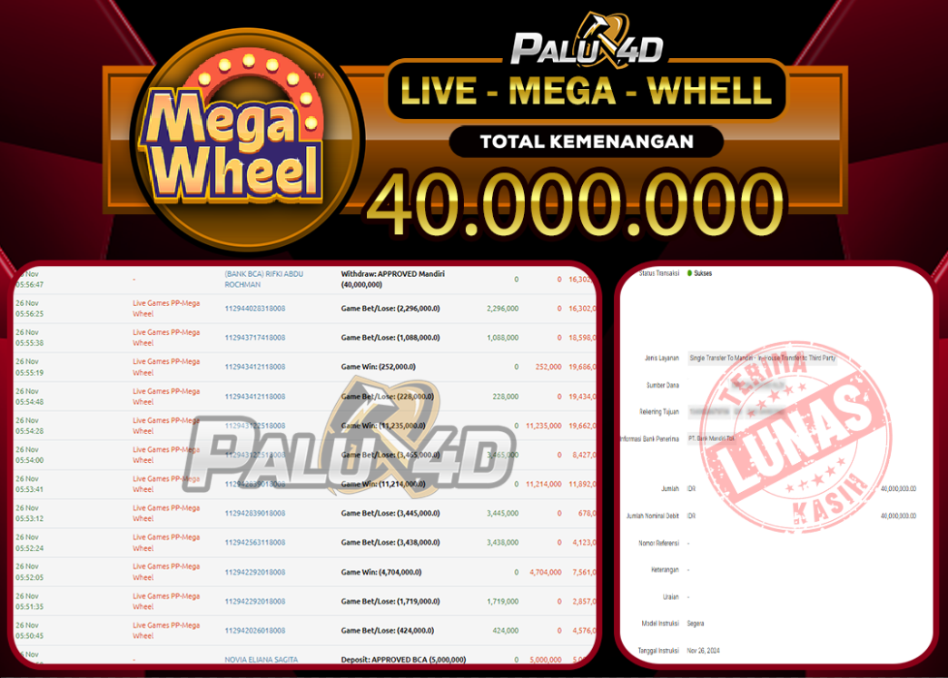 PALU4D – Menang LIVE CASINO MEGA WHEEL   Rp.40.000.000.,- LUNAS