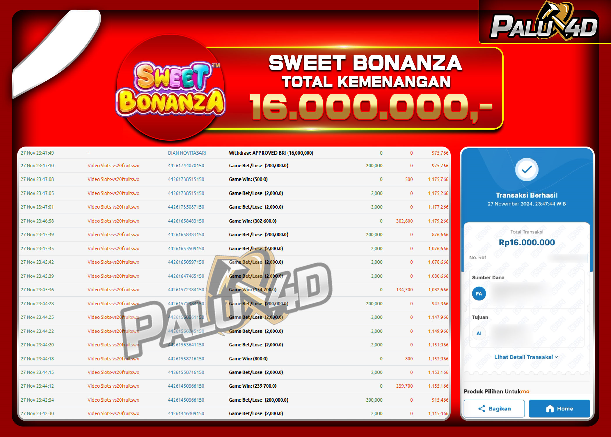 PALU4D – Menang Slot SWEET BONANZA  Rp.16.000.000.,- LUNAS