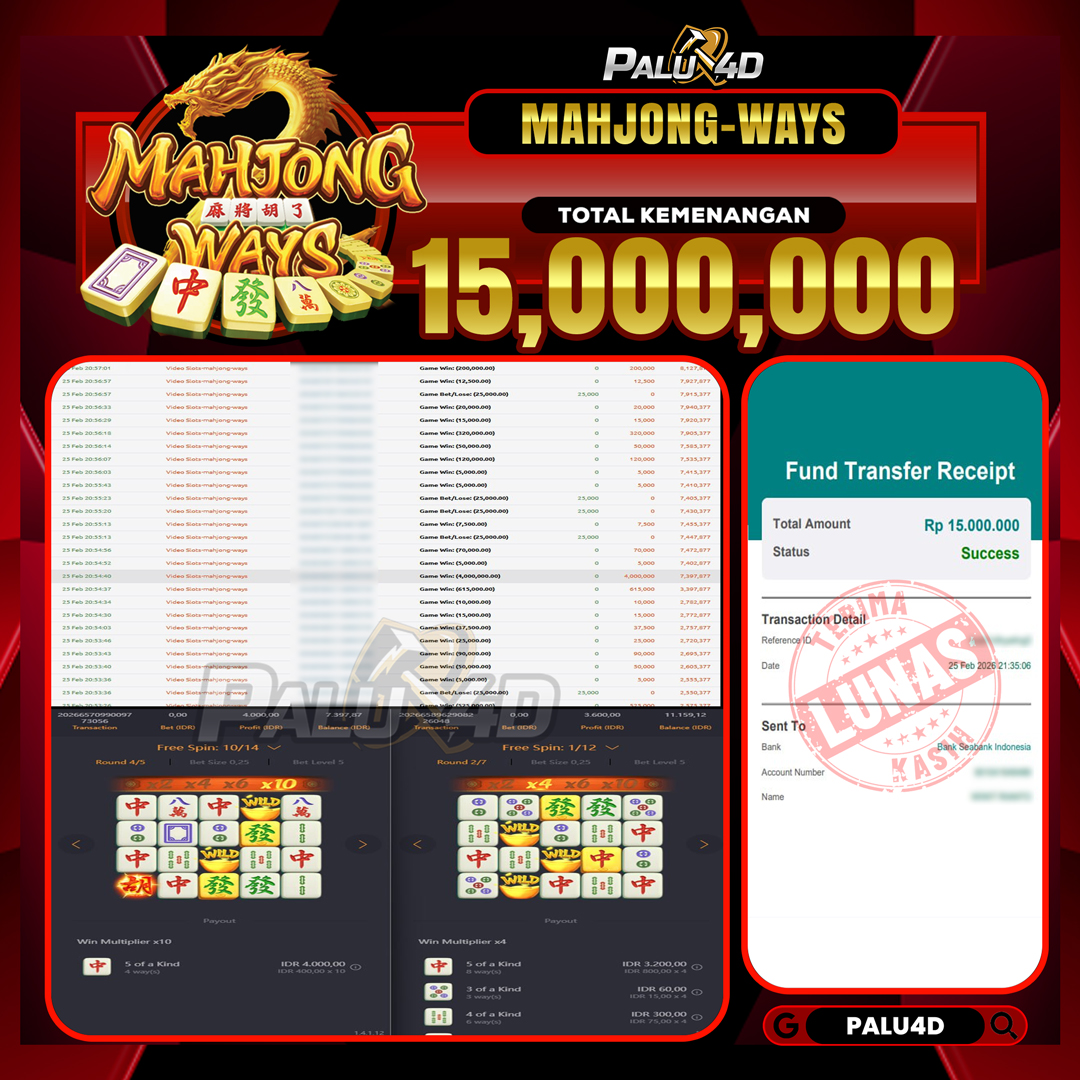 PALU4D – Menang Slot MAHJONG WAYS Rp.15.000.000.,- LUNAS PALU4D – Selamat bagi pemenang yang mendapatkan jackpot hari ini 25 FEBRUARI 2026 di game Slot […]