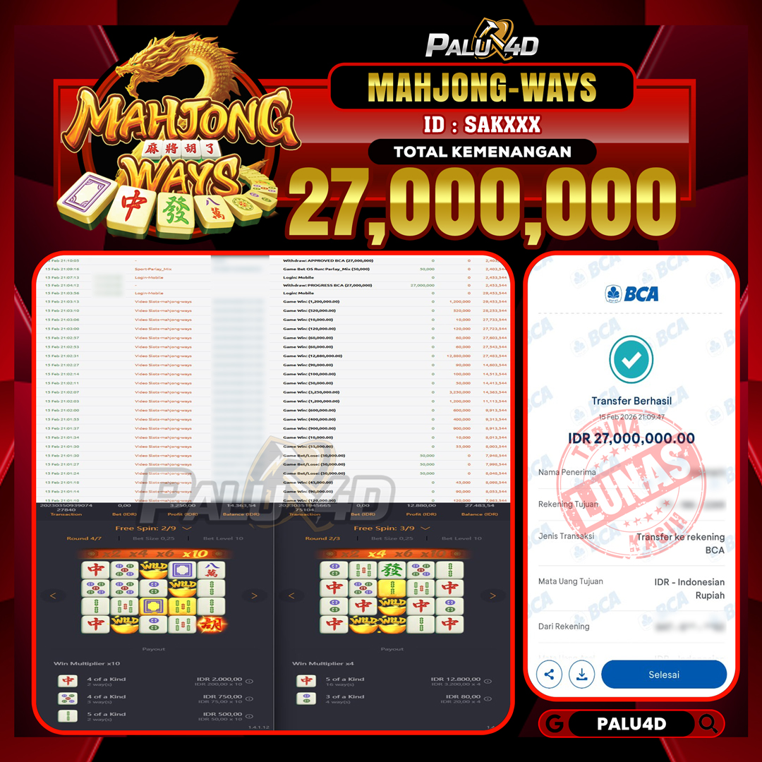 PALU4D – Menang Slot MAHJONG WAYS Rp.27.000.000.,- LUNAS PALU4D – Selamat bagi pemenang yang mendapatkan jackpot hari ini 15 FEBRUARI 2026 di game Slot […]