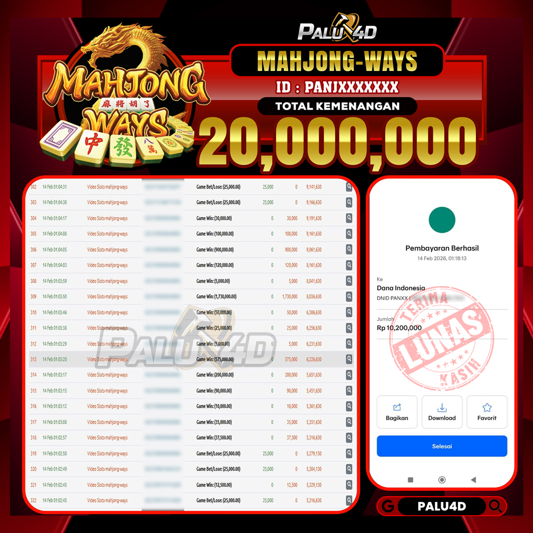 PALU4D – Menang Slot MAHJONG WAYS Rp.20.000.000.,- LUNAS PALU4D – Selamat bagi pemenang yang mendapatkan jackpot hari ini 14 FEBRUARI 2026 di game Slot […]