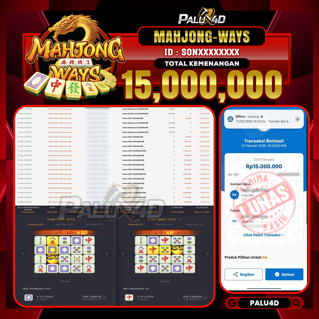PALU4D – Menang Slot MAHJONG WAYS Rp.15.000.000.,- LUNAS PALU4D – Selamat bagi pemenang yang mendapatkan jackpot hari ini 12 FEBRUARI 2026 di game Slot […]