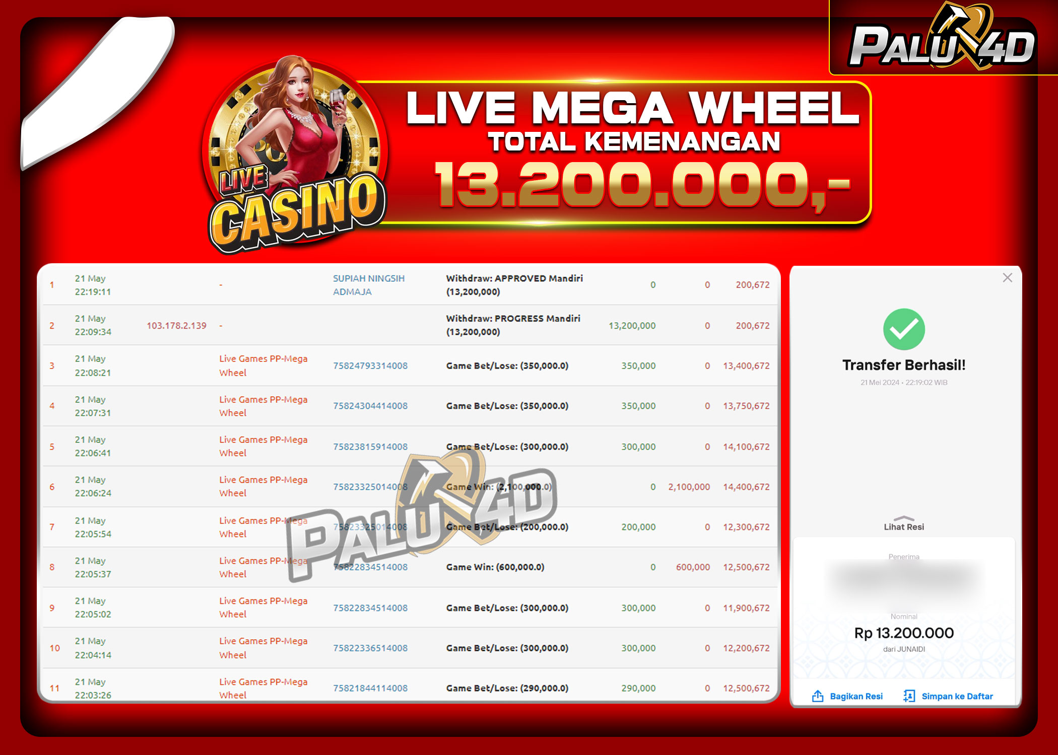 30/05/2024LIVE CASINO PALU4D – Menang Live Games MEGA WHEEL Rp.13.200.000.,- LUNAS PALU4D – Menang Live Games MEGA WHEEL Rp.13.200.000.,- LUNAS PALU4D – Selamat bagi pemenang yang mendapatkan jackpot hari ini 21 May 2024 […]