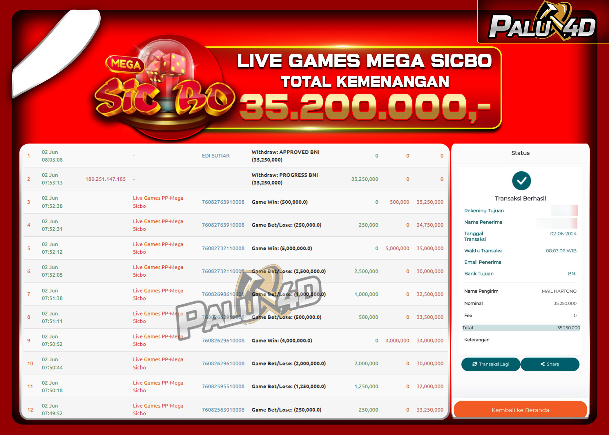 02/06/2024LIVE CASINO PALU4D – Menang Live Games MEGA SICBO Rp35.200.000.,- LUNAS PALU4D – Menang Live Games MEGA SICBO Rp35.200.000.,- LUNAS PALU4D – Selamat bagi pemenang yang mendapatkan jackpot hari ini 2 Juni 2024 […]