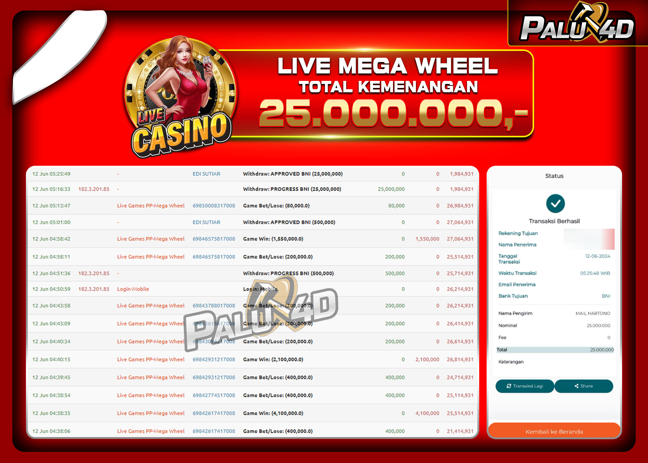 12/06/2024LIVE CASINO PALU4D – Menang Live Games MEGA WHEEL Rp25.000.000.,- LUNAS PALU4D – Menang Live Games MEGA WHEEL Rp25.000.000.,- LUNAS PALU4D – Selamat bagi pemenang yang mendapatkan jackpot hari ini 12 Juni 2024 […]