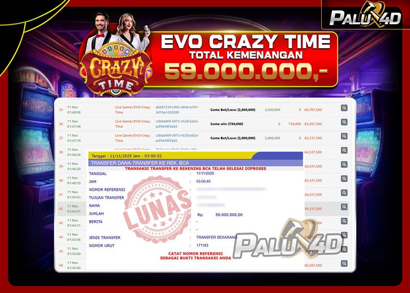 19/11/2025LIVE CASINO PALU4D – Menang Live Games EVO CRAZY TIME Rp 20.000.000.,- LUNAS PALU4D – Menang Live Games EVO CRAZY TIME Rp 20.000.000.,- LUNAS PALU4D – Selamat bagi pemenang yang mendapatkan jackpot hari ini 19 […]
